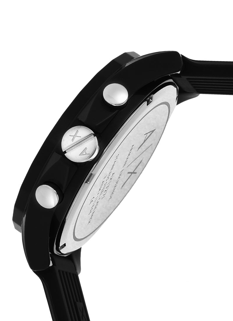 Black resin case with a black rubber strap. Fixed black resin bezel. Black dial with silver-tone hands and index hour markers. Minute markers around the outer rim. The Armani Exchange logo appears at the 12 o'clock position. Dial Type: Analog. Luminescent hands and markers. Date display between the 4 and 5 o'clock positions. Chronograph - three sub-dials displaying: 60 second, 30 minute and 24 hours. Quartz movement. Scratch resistant mineral crystal. Push / pull crown. Solid case back. Case size: 44 mm. Case thickness: 12 mm. Round case shape. Band width: 22 mm. Tang clasp. Water resistant at 50 meters / 165 feet. Functions: chronograph, date, hour, minute, second. Additional Info: in general, suitable for short periods of recreational swimming, but not diving or snorkeling. Dress watch style. Armani Exchange Active Chronograph Men's Watch AX1326.