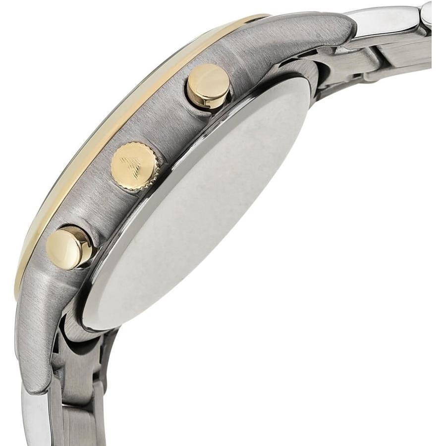 This Emporio Armani Renato Chronograph Silver Dial Men's Watch AR11076 comes in stainless steel case with a two-tone (silver-tone and yellow gold-tone) stainless steel bracelet. Fixed yellow gold-tone bezel. Silver dial with yellow gold-tone hands and index hour markers. Minute markers around the outer rim. The Emporio Armani Eagle appears at the 12 o'clock position. Dial Type: Analog. Date display between the 4 and 5 o'clock positions. Chronograph - three sub-dials displaying: 60 second, 60 minute and 24 hours. Quartz movement. Scratch resistant mineral crystal. Pull / push crown. Solid case back. Round case shape. Case size: 43 mm. Case thickness: 11 mm. Band width: 22 mm. Deployment clasp with a push button release. Water resistant at 50 meters / 165 feet. Functions: chronograph, date, hour, minute, second. Dress watch style.