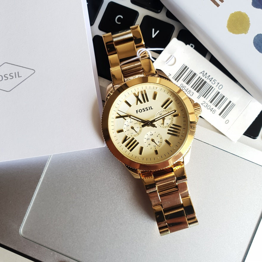 This Fossil Cecile Multifunction Champagne Dial Ladies Watch AM4510 comes in gold-tone stainless steel case and bracelet. Fixed gold-tone bezel. Champagne dial with gold-tone hands and alternating index and Roman numeral hour markers. Minute markers around the outer rim. Dial Type: Analog. Luminescent hands. Three multi-function sub-dials displaying: day of the week, date and 24 hour. Quartz movement. Scratch resistant mineral crystal. Pull / push crown. Solid case back. Case diameter: 40 mm. Case thickness: 12 mm. Round case shape. Band width: 20 mm. Band length: 6.5 inches. Deployment clasp. Water resistant at 100 meters / 330 feet. Functions: chronograph, day, date, hour, minute, second, 24 hours. Casual watch style.