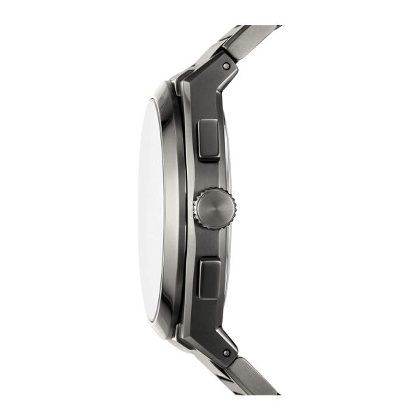 Gunmetal-plated stainless steel case and bracelet. Fixed gunmetal-plated bezel. Grey dial with luminous silver-tone hands and index hour markers. Arabic numeral minute markers (at 5 minute intervals). Minute markers around the outer rim. Dial Type: Analog. Luminescent hands and markers. Date display at the 3 o'clock position. Chronograph - three sub-dials displaying: 60 second, 30 minute and 12-24 hours. Quartz movement. Scratch resistant mineral crystal. Solid case back. Round case shape. Case size: 42 mm. Case thickness: 11 mm. Band width: 18 mm. Fold over clasp with a push button release. Water resistant at 50 meters / 165 feet. Functions: chronograph, date, hour, minute, second. Everett Series. Casual watch style. Fossil Everett Chronograph Quartz Grey Dial Men's Watch FS5830.