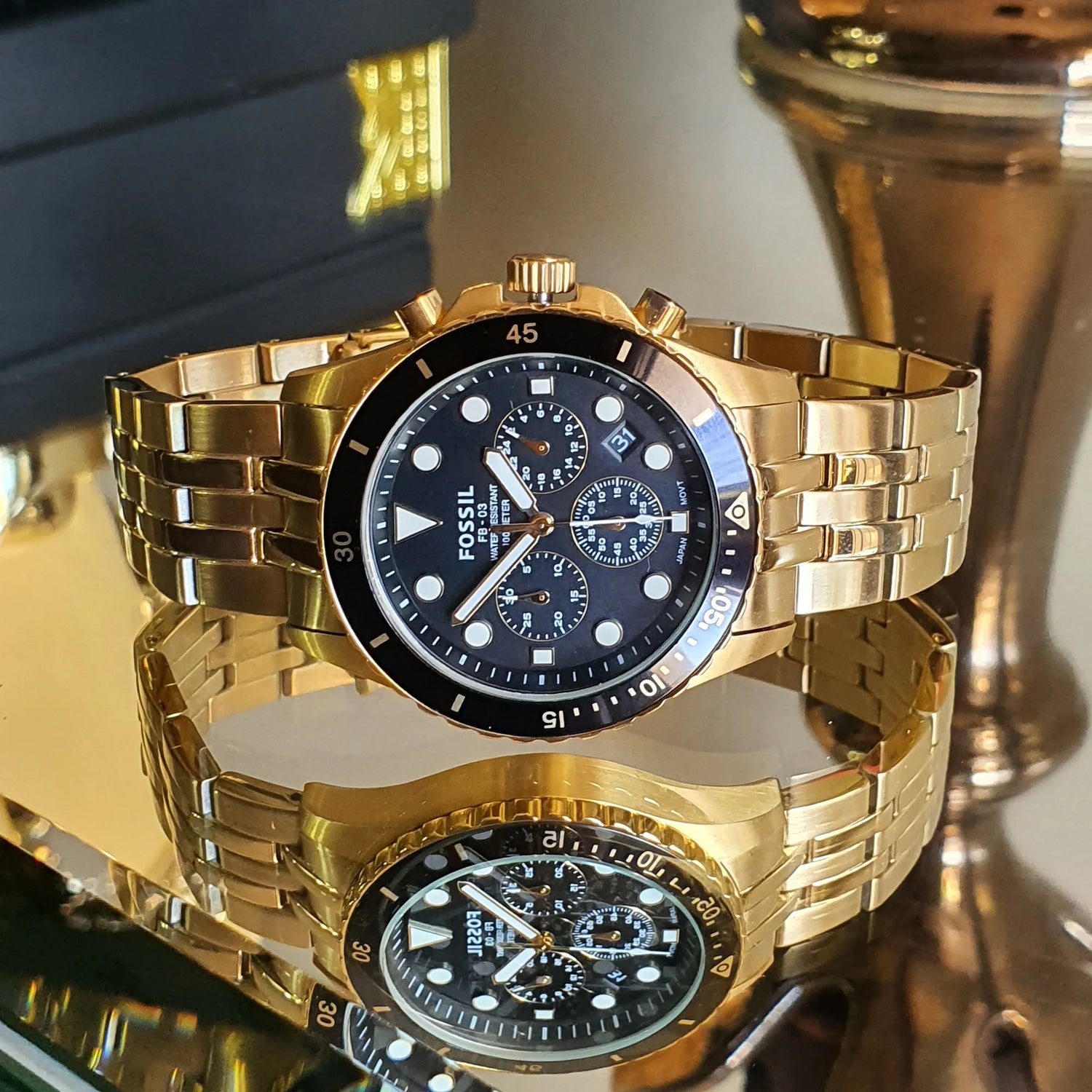 Gold-tone stainless steel case and bracelet. Fixed gold-tone bezel with an inlaid black ring. Black dial with luminous gold-tone hands and dot hour markers. Minute markers around the outer rim. Dial Type: Analog. Luminescent hands and markers. Date display between the 4 and 5 o'clock positions. Quartz movement. Scratch resistant mineral crystal. Pull / push crown. Solid case back. Round case shape. Case size: 42 mm. Case thickness: 12 m. Band width: 22 mm. Fold over clasp with a push button release. Water resistant at 100 meters / 330 feet. Functions: chronograph, date, hour, minute, second. Fb-01 Series. Casual watch style. Watch label: Japan Movt. Fossil FB-01 Chronograph Quartz Black Dial Men's Watch FS5836.