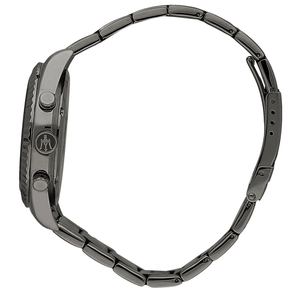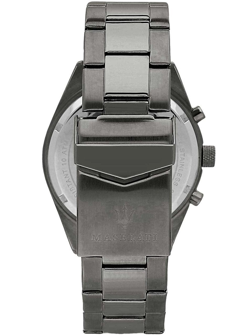 Grey-plated stainless steel case and bracelet. Fixed fluted grey-plated bezel. Blue dial with luminous silver-tone hands and index hour markers. Minute markers around the outer rim. Dial Type: Analog. Luminescent hands. Three multi-function sub-dials displaying: 24 hours. date and day of the week. Quartz movement. Scratch resistant mineral crystal. Screw down crown. Screwed case back. Round case shape. Case size: 43 mm. Case thickness: 11 mm. Band width: 22 mm. Fold over clasp with a safety release. Water resistant at 100 meters / 330 feet. Functions: chronograph, date, hour, minute, second. Competizione Series. Casual watch style. Maserati Competizione Chronograph Quartz Blue Dial Men's Watch R8853100019.