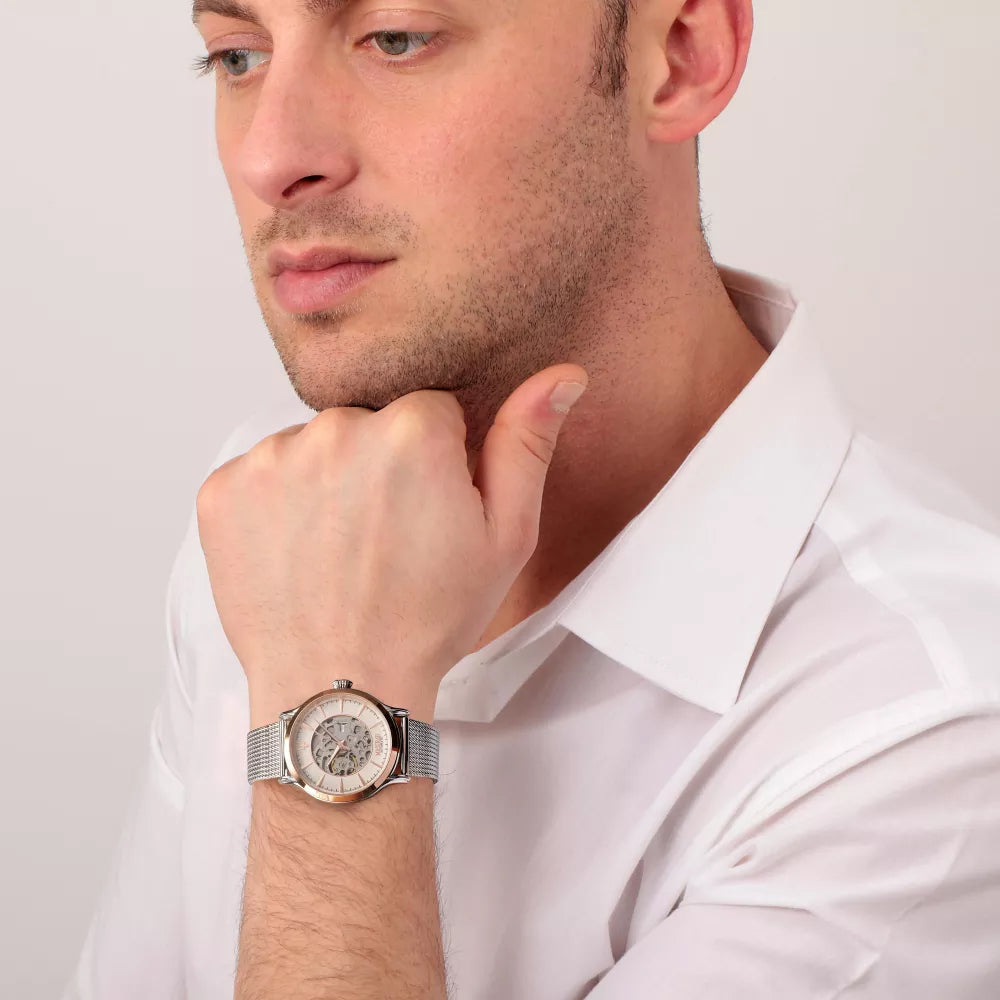 - Dial Color: Silver (Skeleton Center) with rose gold bezel