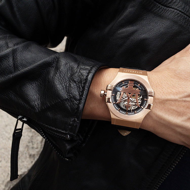 This Maserati Potenza Automatic Black Dial Men's Watch R8821108002 comes in rose gold-tone stainless steel case with a black leather strap. Fixed rose gold-tone stainless steel bezel. Black/skeleton dial with rose gold-tone hands and index hour markers. Minute markers around the outer rim. Dial Type: Analog. Automatic movement. Scratch resistant mineral crystal. Screw down crown. Round case shape, case size: 42 mm, case thickness: 12.6 mm. Buckle clasp. Water resistant at 100 meters / 330 feet. Functions: hour, minute, second. Dress watch style.