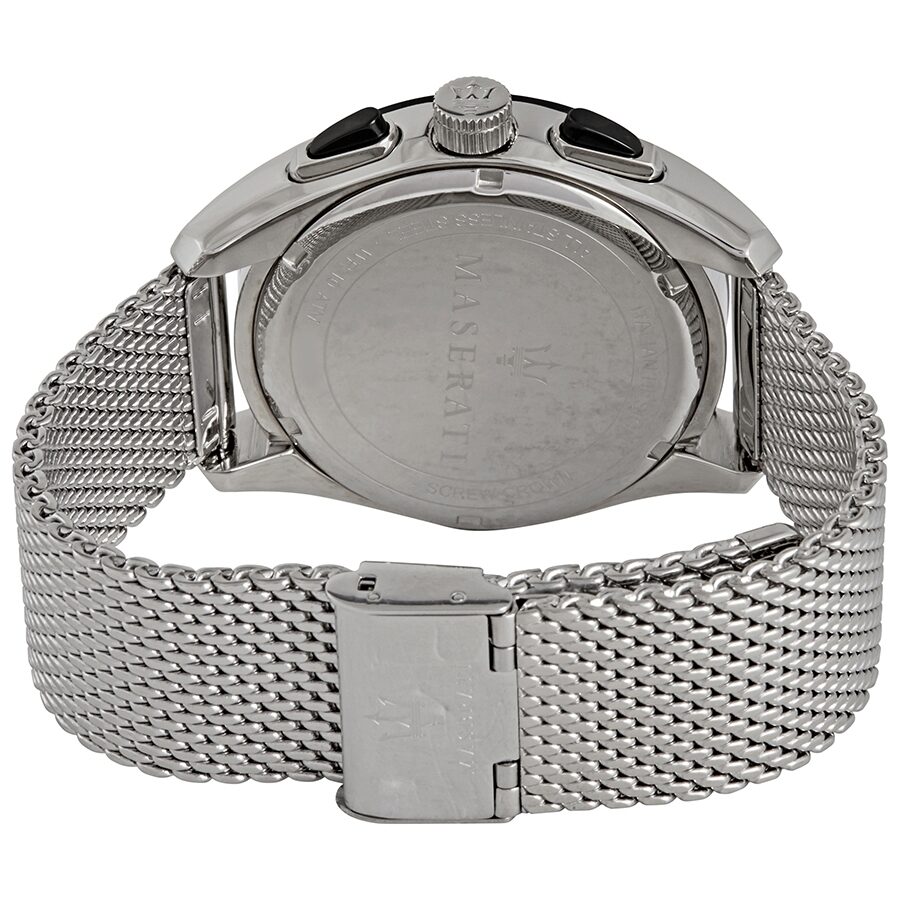 Stainless steel case with a stainless steel mesh bracelet. Fixed black PVD bezel. Black dial with luminous silver-tone hands and Arabic numeral hour markers. Minute markers around the outer rim. Dial Type: Analog. Luminescent hands. Chronograph - three sub-dials displaying: 60 second, 60 minute and 24 hour. Miyota caliber JS50-00C quartz movement. Scratch resistant mineral crystal. Screw down crown. Solid case back. Round case shape. Case size: 45 mm. Case thickness: 13 mm. Band width: 22 mm. Fold over clasp. Water resistant at 100 meters / 330 feet. Functions: chronograph, hour, minute, second. Traguardo Series. Casual watch style. Watch label: Japan Movt. Maserati Traguardo Chronograph Black Dial Men's Watch R8873612005.
