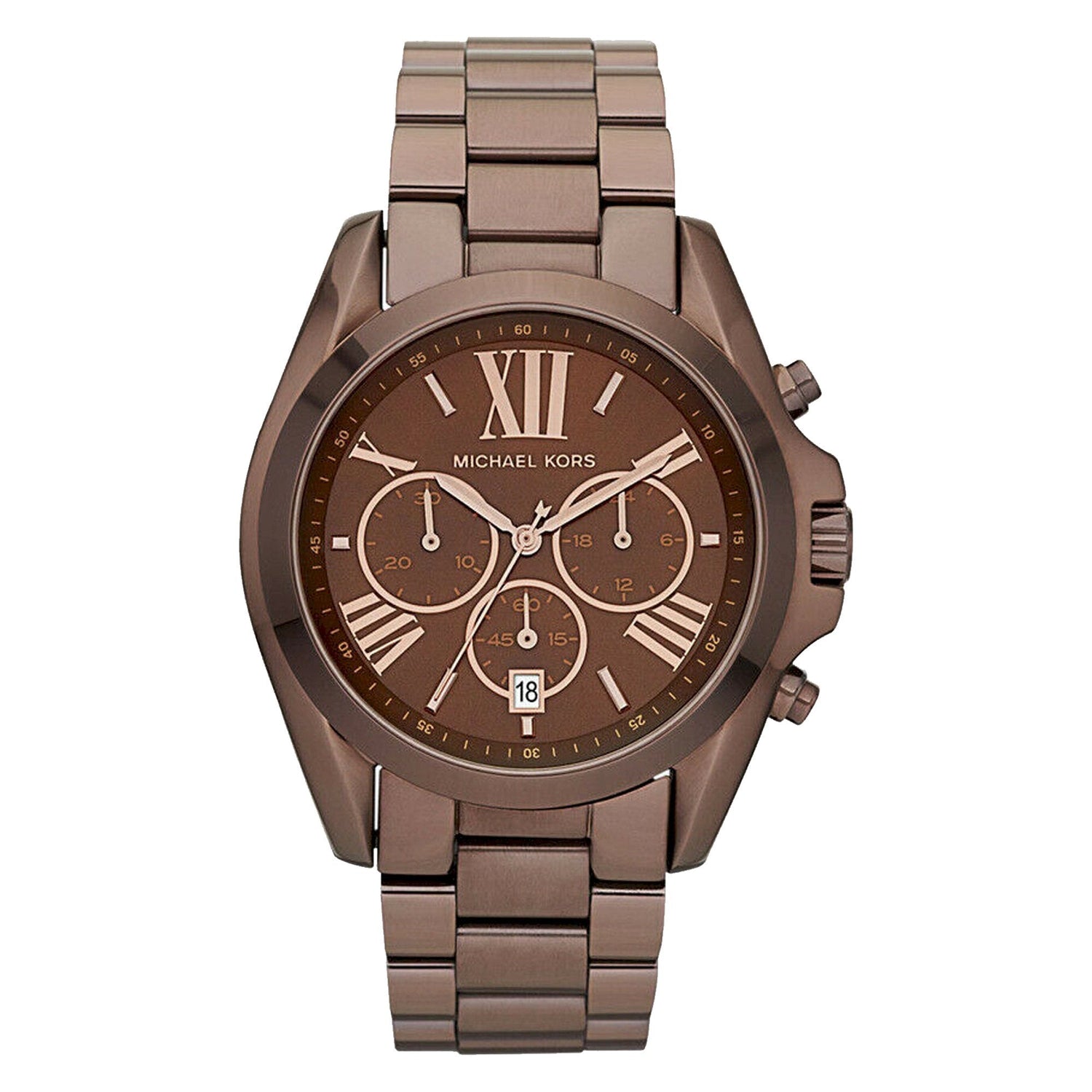 This Michael Kors Bradshaw Chronograph Espresso Dial Watch MK5628 comes in espresso ion-plated stainless steel case and bracelet. Fixed expresso ion-plated bezel. Brown dial with rose gold-tone hands and alternating Roman numeral and index hour markers. Minute markers around the outer rim. Dial Type: Analog. Date display at the 6 o'clock position. Chronograph - three sub-dials displaying: 60 second, 30 minute and 24 hours. Quartz movement. Scratch resistant mineral crystal. Pull / push crown. Solid case back. Case diameter: 43 mm. Case thickness: 11 mm. Round case shape. Band width: 20 mm. Fold over clasp with safety release. Water resistant at 100 meters / 330 feet. Functions: chronograph, date, hour, minute, second. Casual watch style.