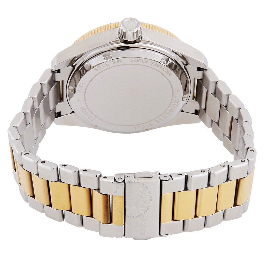 Silver-tone stainless steel case with a two-tone (silver-tone and gold-tone) stainless steel bracelet. Uni-directional rotating gold-tone stainless steel bezel with a blue top ring. Blue dial with gold-tone hands and index hour markers. Minute markers around the outer rim. Dial Type: Analog. Luminescent hands and markers. Date display at the 3 o'clock position. Quartz movement. Scratch resistant mineral crystal. Screw down crown. Solid case back. Round case shape, case size: 42 mm. Band width: 22 mm. Fold over clasp with a safety release. Water resistant at 200 meters / 660 feet. Functions: date, hour, minute, second. Maritime Series. Sport watch style. Michael Kors Maritime Quartz Blue Dial Men's Watch MK9169.