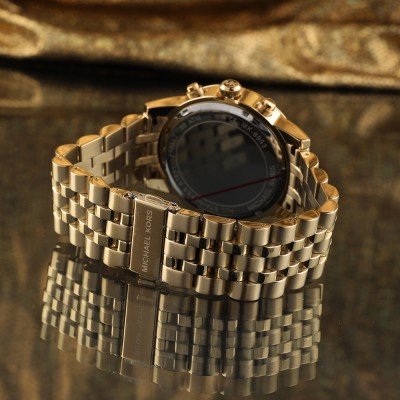 A Michael Kors MK8953 Hutton watch for men, with a 43mm round gold stainless steel case, a gold dial, and a matching gold band. It is powered by a quartz movement.