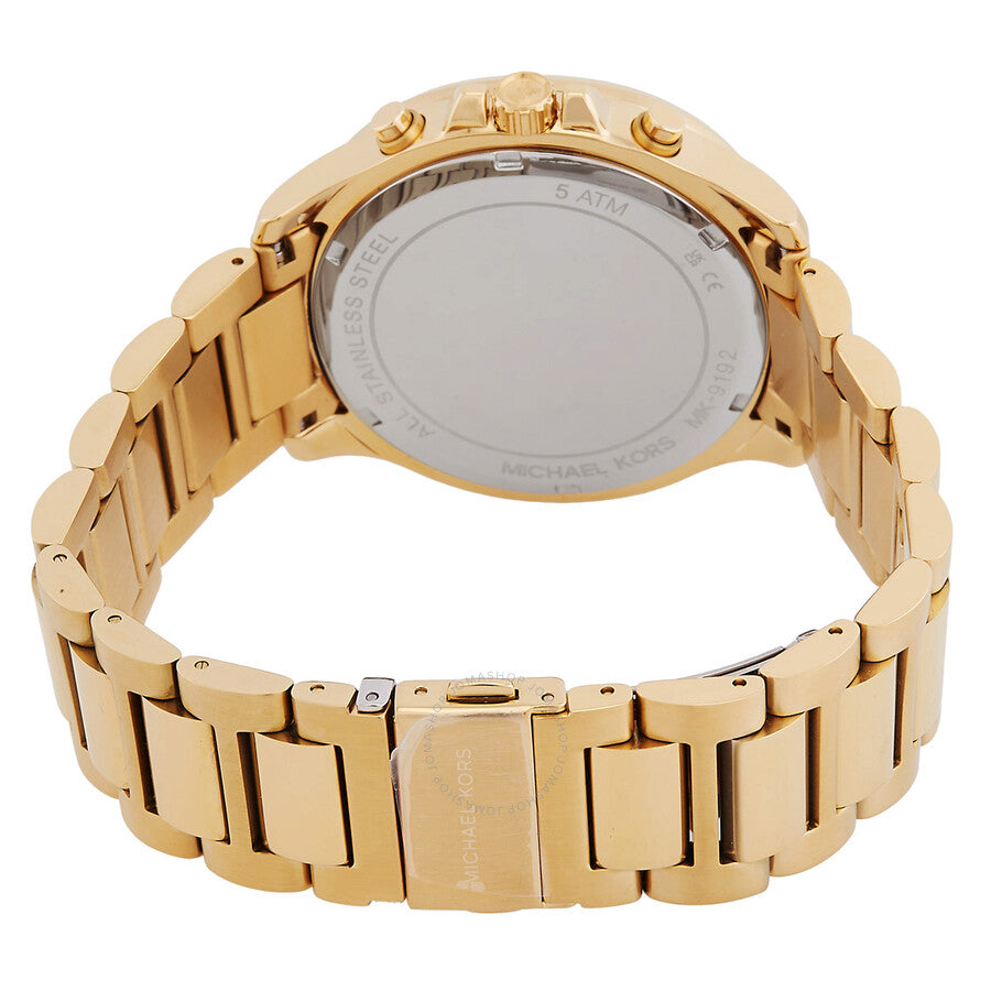 Gold-tone stainless steel case and bracelet. Fixed gold-tone stainless steel bezel. Black dial with gold-tone hands and index-Arabic numeral hour markers. Minute markers around the outer rim. Dial Type: Analog. Luminescent hands and markers. Date display between 4 and 5 o'clock position. Chronograph - three sub-dials displaying: 60 second, 30 minute and 24 hour. Quartz movement. Scratch resistant mineral crystal. Pull / push crown. Solid case back. Round case shape, case size: 44 mm. Band width: 22 mm. Fold over clasp with a safety release. Water resistant at 30 meters / 100 feet. Functions: chronograph, date, hour, minute, second. Sage Series. Sport watch style. Michael Kors Sage Chronograph Quartz Black Dial Men's Watch MK9192.