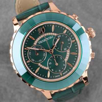 The Swarovski 5452498 Octea Lux watch features a 39mm oval rose gold stainless steel case with a silver dial. It is fitted with a green leather strap and buckle.