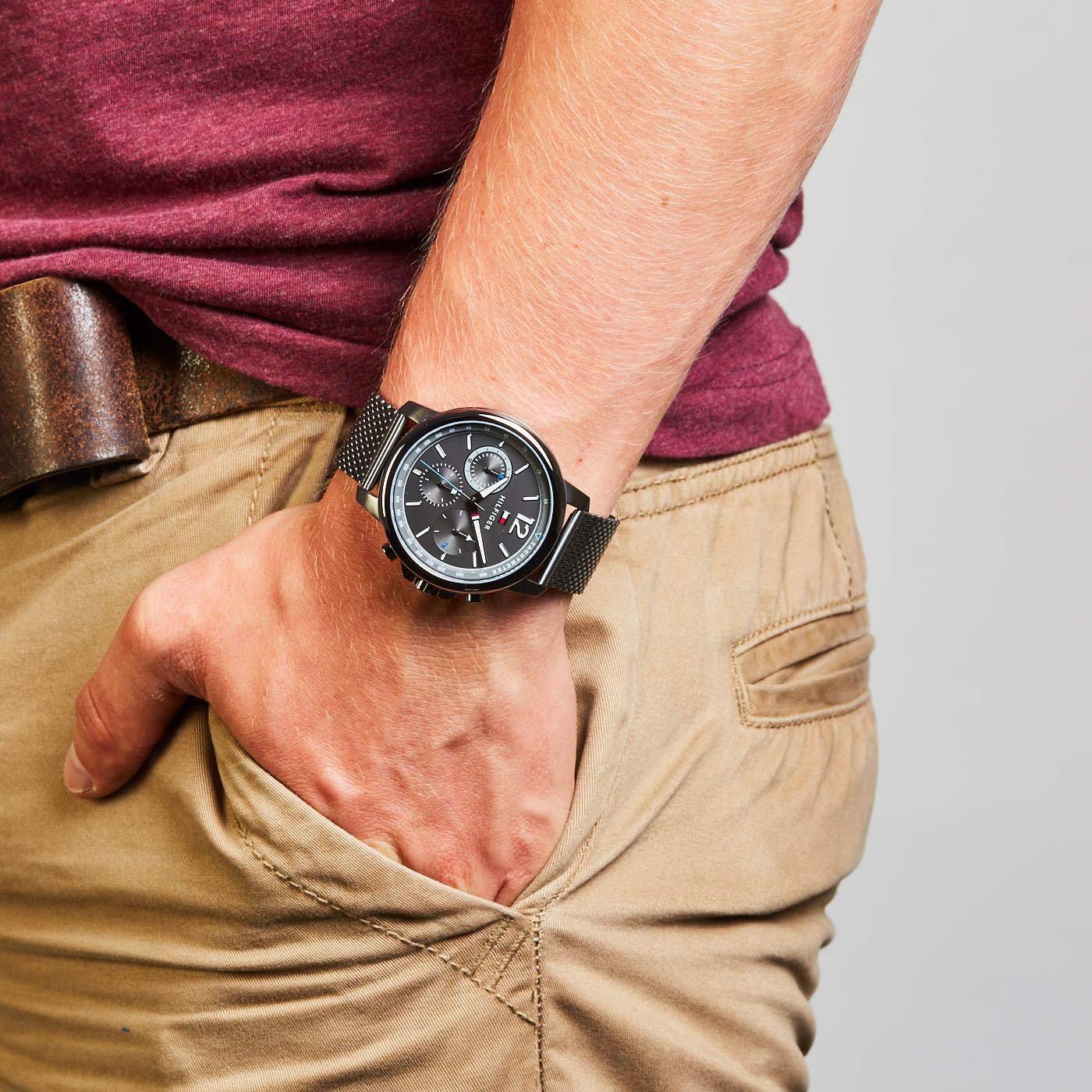 Tommy Hilfiger Chronograph Grey Dial Men's Watch 1791530. Crafted of Stainless Steel with Black IP, the 44mm case is sure to please. The multi-eye dial features stick markers and an intricate minute track, detailed with the Tommy Hilfiger flag Logo positioned at 12:00.