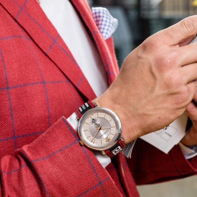 Versace V Circle Silver Dial Two Tone Leather Strap Watch for Men - VEBQ01319